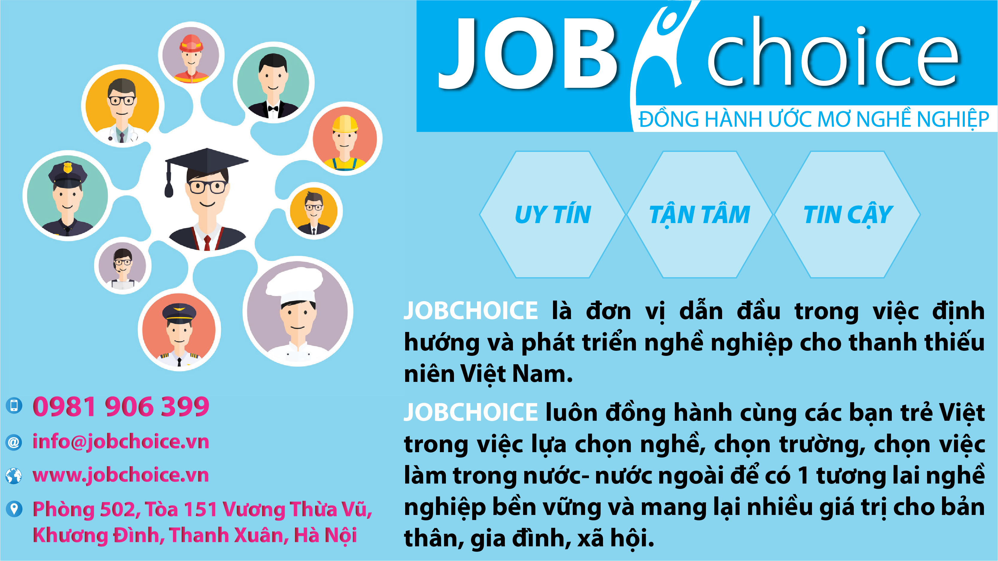 Trước viễn cảnh này, Công ty CP Phát triển nghề nghiệp Tuổi trẻ Việt - với thương hiệu Jobchoice được thành lập bởi những chuyên gia tâm huyết có gần 20 năm kinh nghiệm về lĩnh vực nhân sự và giáo dục. Mang trong mình Sứ mệnh: Phát triển vì tương lai nghề nghiệp cho Tuổi trẻ Việt, với tầm nhìn: Là đơn vị dẫn đầu trong việc định hướng và phát triển nghề nghiệp cho thanh thiếu niên Việt Nam. Quyết tâm xây dựng và phát triển bền vững trên nền tảng các giá trị cốt lõi Uy tín Tận tâm và Tin cậy, Jobchoice cam kết luôn đồng hành cùng các bạn trẻ Việt trong việc chọn nghề, chọn trường, chọn việc làm trong và ngoài nước, để có một tương lai nghề nghiệp ổn định và mang lại giá trị đích thực cho bản thân gia đình và xã hội.